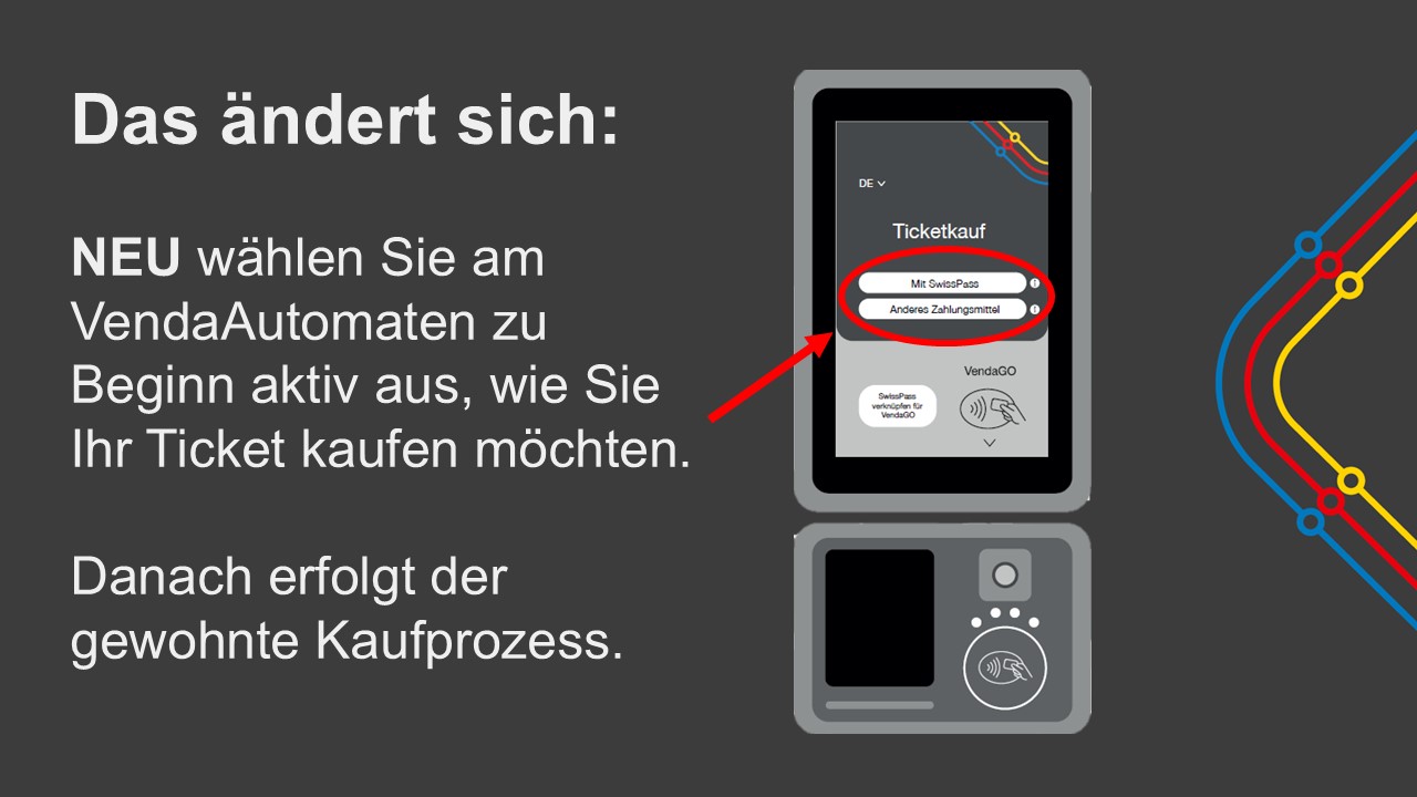 Mit dieser Systemerweiterung ändert sich bei allen VendaAutomaten der Verkaufsprozess leicht. Neu wählen Sie zu Beginn aktiv aus, ob Sie Ihr Ticket mit SwissPass oder mit einem anderen Zahlungsmittel kaufen.