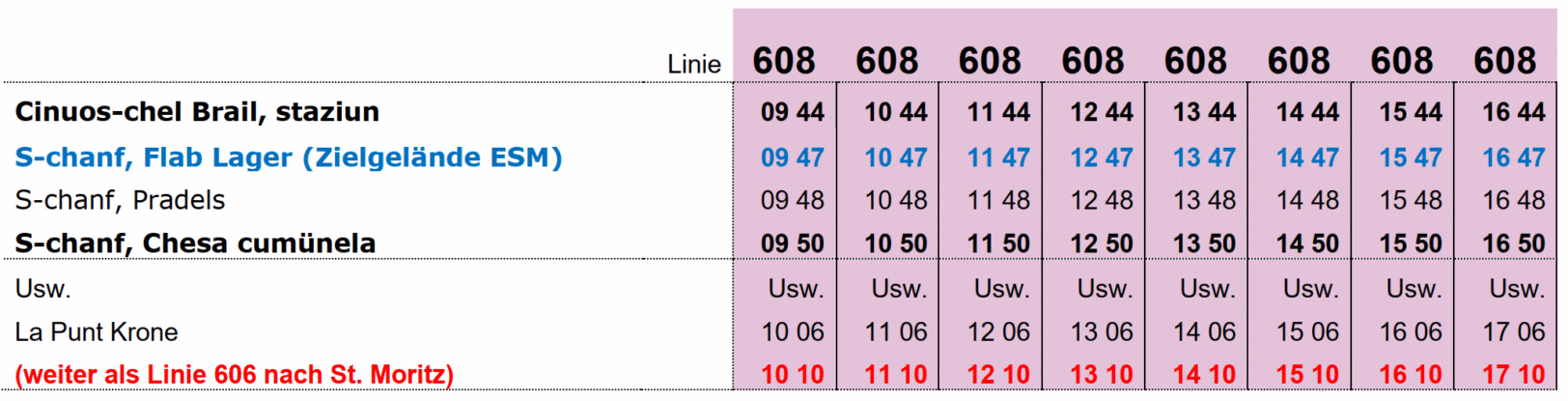 - S-chanf, Flab Lager (Zielgelände) bedient durch Linie 608: